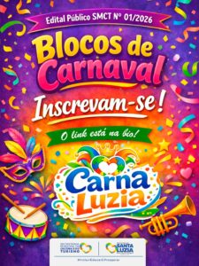 A Prefeitura de Santa Luzia, por meio da Secretaria Municipal da Cultura e do Turismo, está com inscrições abertas para os blocos carnavalescos interessados em integrar a programação oficial do Carnaval 2026, conforme o Edital Público SMCT nº 01/2026.