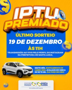 A Prefeitura de Santa Luzia realiza nesta sexta-feira (19/12), às 11h, o último sorteio do programa IPTU Premiado. O evento será transmitido ao vivo pelo perfil oficial da Prefeitura no Instagram.