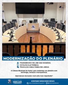 A Câmara Municipal de Santa Luzia continua modernizando com tecnologia, inclusão e transparência. Desta vez, o plenário da Casa passou por uma transformação total. Novos mobiliários foram instalados proporcionando mais conforto e agilidade para os vereadores.