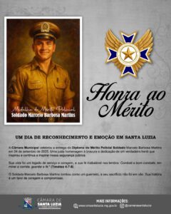 A Câmara Municipal de Santa Luzia celebrou, no último dia 24 de setembro, a entrega do diploma do merito policial soldado Marcelo Barbosa Martins. Uma justa homenagem à bravura e dedicação de um verdadeiro herói que inspirou e continua a inspirar nossa segurança pública.