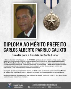 A Câmara Municipal de Santa Luzia, no dia 08 de outubro, agradeceu, de uma maneira honrosa, aqueles que se destacaram e se destacam como agentes políticos e lideranças no município com o diploma Mérito Prefeito Carlos Alberto Parrilo Calixto. Uma justa homenagem a um líder visionário que, com sua garra e compromisso inabalável, transformou a realidade da nossa cidade.