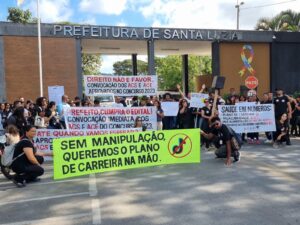 Com faixas e cartazes, eles reivindicam melhores condições de trabalho, plano de carreira, pagamento de insalubridade, aumento no valor do vale alimentação além da convocação dos profissionais aprovados no concurso de 2023.